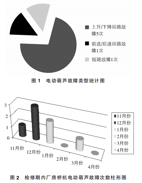 通过对2013-2014年检修期电动免费成人漫画下载故障类型统计及检修期内厂房桥机电动免费成人漫画下载故障次数柱形图的调查分析得出:上升/下降控制回路故障次数为5次,前进/后退控制回路故障1次,短路故障1次,由此可见,电动免费成人漫画下载控制回路的可靠性有待进一步提高。下面就对电动免费成人漫画下载的一些常见故障原因进行分析、探讨。